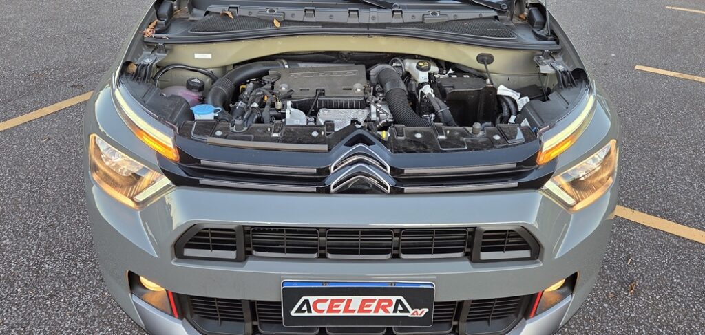 Debaixo do capô do Citroën Basalt Dark Edition, nenhuma surpresa — e isso não é um problema. O conhecido motor 1.0 turbo da família T200, aliado ao câmbio CVT, entrega exatamente o que se espera: eficiência e boa resposta em uso urbano.