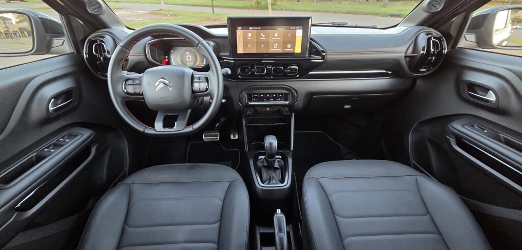 É por dentro que o Citroën Basalt Dark Edition mostra evolução real. A crítica ao acabamento básico não foi ignorada, e essa versão esportiva traz uma cabine mais bem resolvida visualmente.