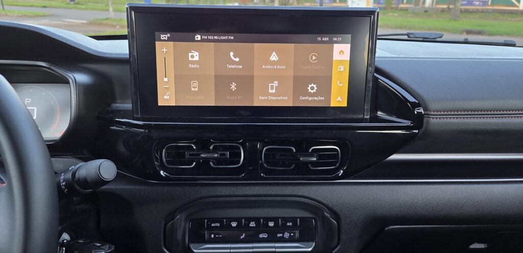 A central multimídia cumpre o básico com eficiência. Conectividade com Android Auto e Apple CarPlay funciona bem, sem travamentos relevantes, mas a interface é simples e pouco explorada.