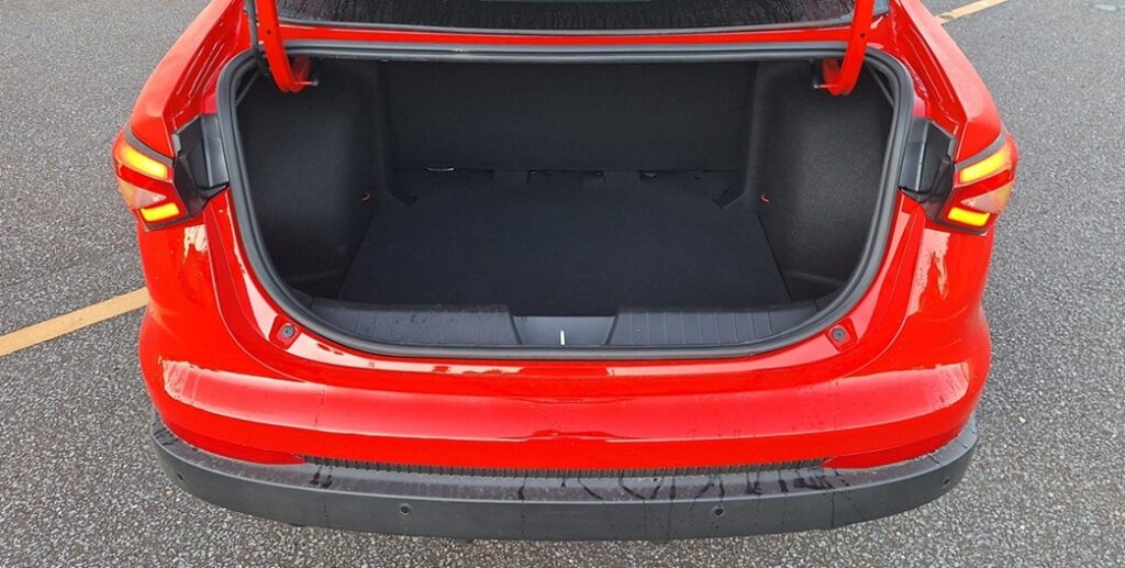 No banco traseiro, o espaço é suficiente para dois adultos com conforto razoável, mas não é referência no segmento. O foco principal está no porta-malas, que impressiona com 525 litros de capacidade — volume comparável ao de modelos de categorias superiores e ideal para viagens ou uso profissional.
