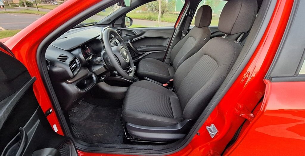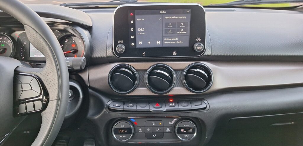 Por dentro, o ambiente segue a mesma lógica. O desenho é agradável e funcional, mas os materiais priorizam durabilidade e baixo custo, com predominância de plásticos rígidos. Em compensação, a central multimídia com espelhamento sem fio e o ar-condicionado automático (no pacote opcional) garantem um nível adequado de conveniência.