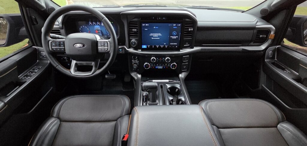 A cabine da Ford F-150 Tremor continua sendo um dos pontos altos. Espaço de sobra, acabamento consistente e uma lista extensa de equipamentos colocam a experiência mais próxima de um SUV de luxo do que de um utilitário de trabalho.