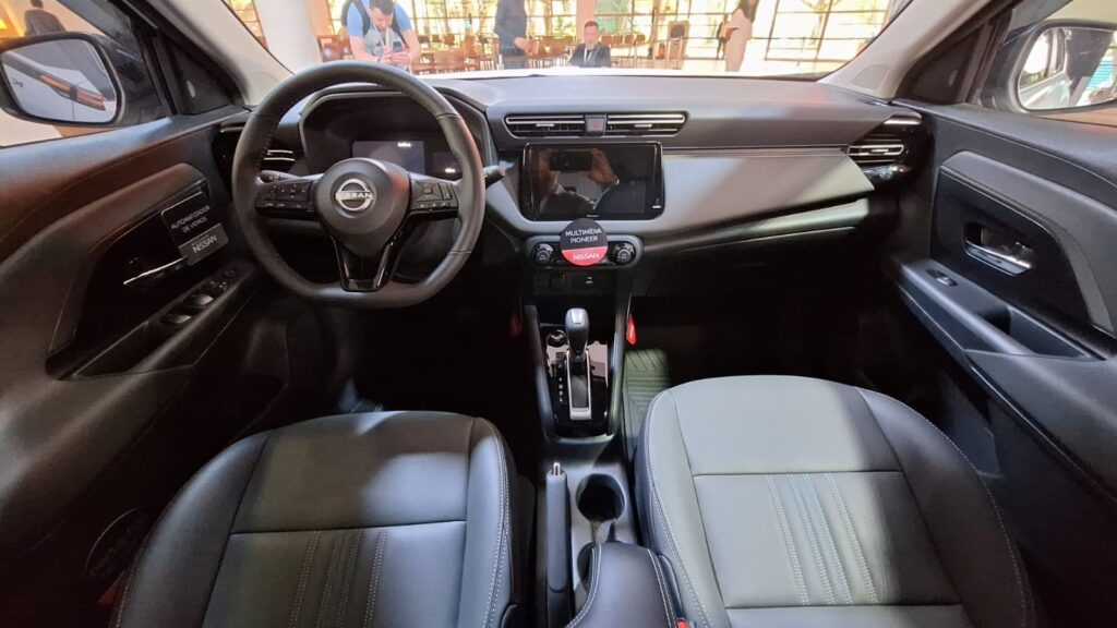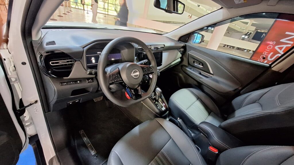 Por dentro, o Nissan Kait recebeu atenção especial: painel digital configurável de 7 polegadas, novos materiais de acabamento e, na versão Exclusive, bancos com padronagem de dois tons que reforçam a sensação de refinamento.
