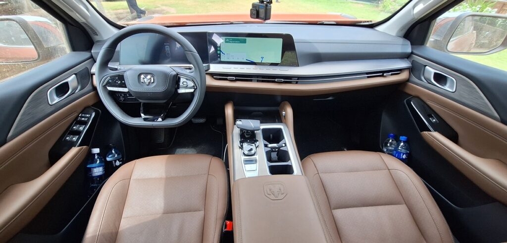 Por dentro, a RAM Dakota tem bom nível de acabamento, com materiais macios ao toque e bancos de couro com ajustes elétricos. A Warlock aposta em um ambiente mais sóbrio, enquanto a Laramie se diferencia pelo revestimento em tom marrom e detalhes que reforçam a proposta premium.