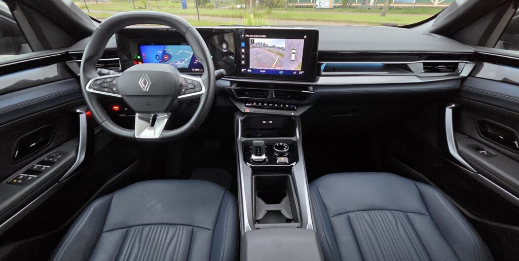 Ao entrar no Renault Boreal Iconic, a sensação é de evolução clara em relação aos antigos modelos da marca vendidos no Brasil. O painel tem desenho moderno e materiais agradáveis ao toque, com iluminação ambiente configurável e bons encaixes entre as peças.