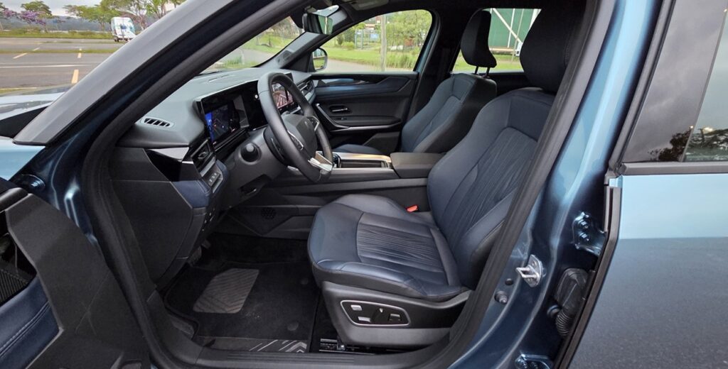 O isolamento acústico também merece elogios, mantendo o interior silencioso em velocidade de cruzeiro. As rodas grandes, com pneus de perfil relativamente baixo, transmitem um pouco das imperfeições do piso, mas sem comprometer o conforto geral.