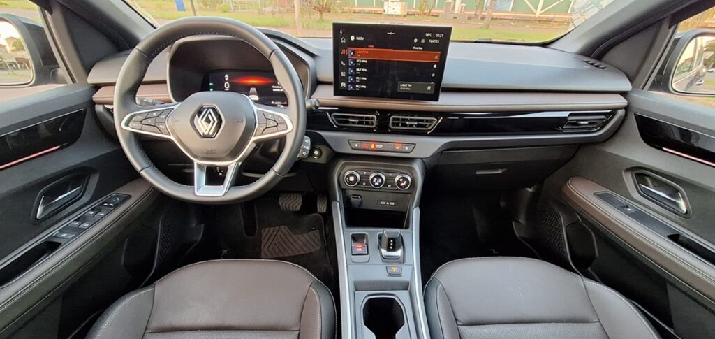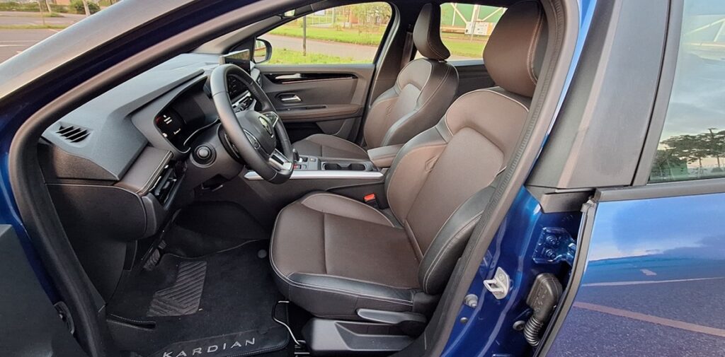 Ao abrir a porta do Renault Kardian Iconic, fica evidente que o salto mais relevante está no ambiente interno. O acabamento ganhou novos materiais, com destaque para os bancos em revestimento sintético marrom, tonalidade que se estende às portas e ao painel, criando uma atmosfera mais elegante e coerente com a proposta da versão.