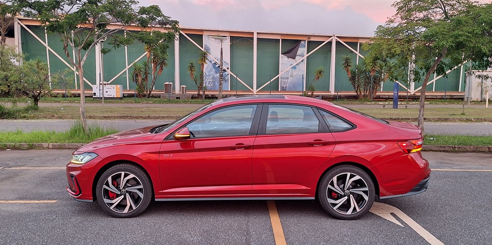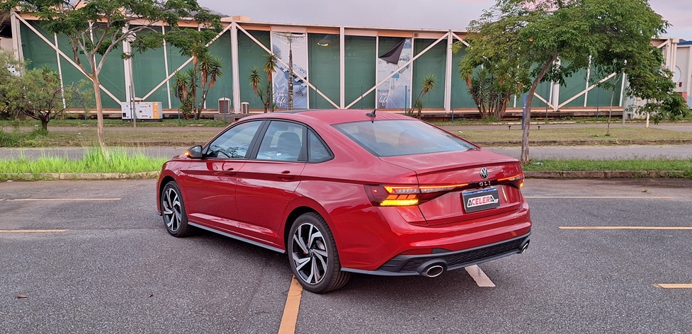 Mas o VW Jetta GLI não virou um carro espalhafatoso. Ele continua discreto — quase um sleeper. As rodas de 18 polegadas, as pinças vermelhas e o friso rubro na grade são pistas suficientes para quem sabe o que está olhando. Para o restante do trânsito, parece apenas “um Jetta bem cuidado”.