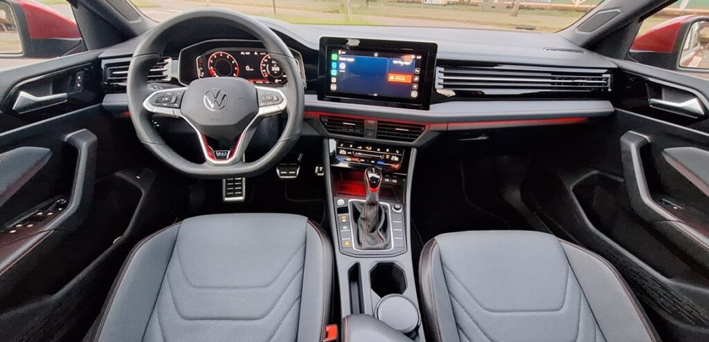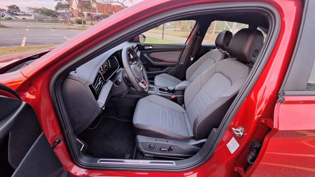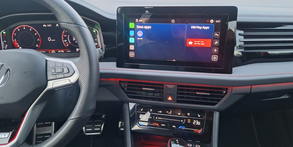 Por dentro, o ambiente do VW Jetta GLI é escuro, esportivo e funcional. O VW Play de 10 polegadas e o painel digital cumprem bem o papel, mas o acabamento revela a origem americana do projeto: há plástico rígido além do que se espera por quase R$ 280 mil. Nada que comprometa, mas também nada que impressione.