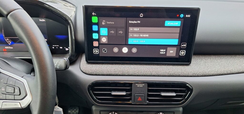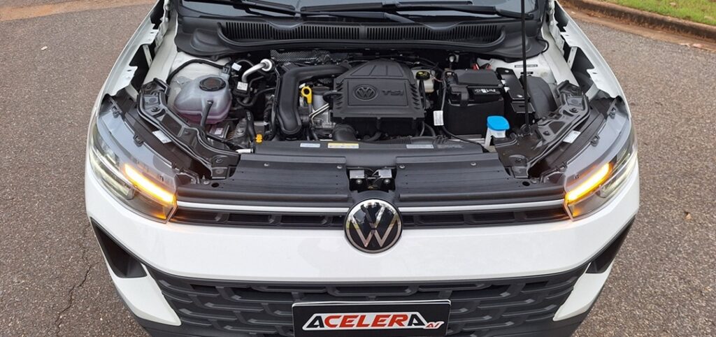 Sob o capô, o 1.0 turbo de três cilindros entrega 116 cv e 16,8 kgfm com etanol — o mesmo conjunto usado em Polo e Virtus. O câmbio manual de cinco marchas mantém o padrão de excelência da VW, com engates curtos e precisos.