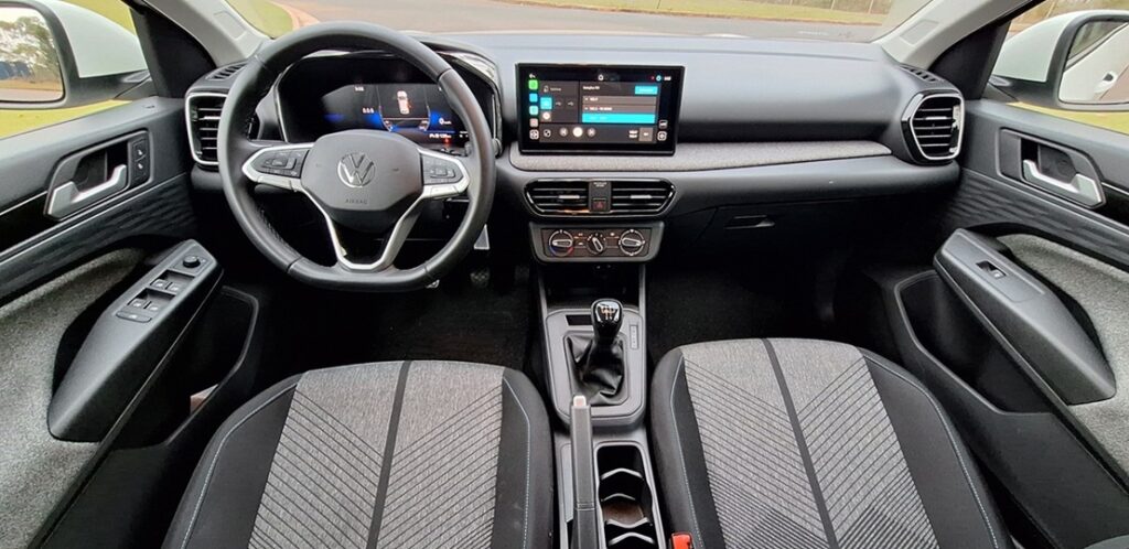 O painel traz um visual inédito entre os compactos da VW, com multimídia de 10,1 polegadas e painel digital de 8 polegadas, ambos de série. O conjunto tem boa usabilidade, mas falta um pouco de refinamento, há plásticos rígidos e apenas alguns detalhes em preto-brilhante ou tecido para quebrar a monotonia.