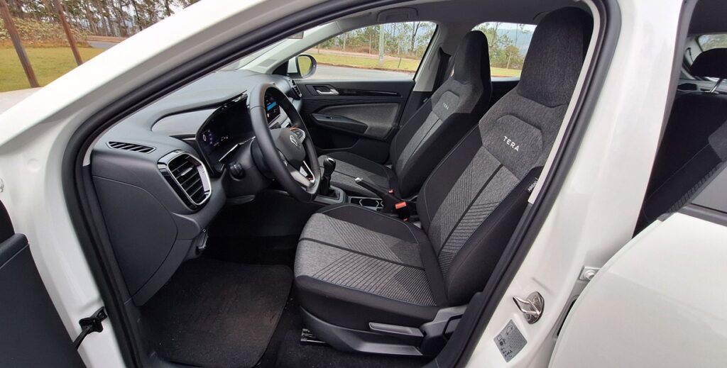 No dia a dia urbano, o VW Tera 1.0 TSI é ágil nas arrancadas e leve ao dirigir. Mas, ao exigir mais do motor, surge um certo atraso na resposta do acelerador, típico das calibrações mais recentes voltadas à economia e emissões. Em viagens ou com o carro cheio, o desempenho fica apenas mediano: o motor precisa girar alto para manter ritmo, e o isolamento acústico não ajuda.